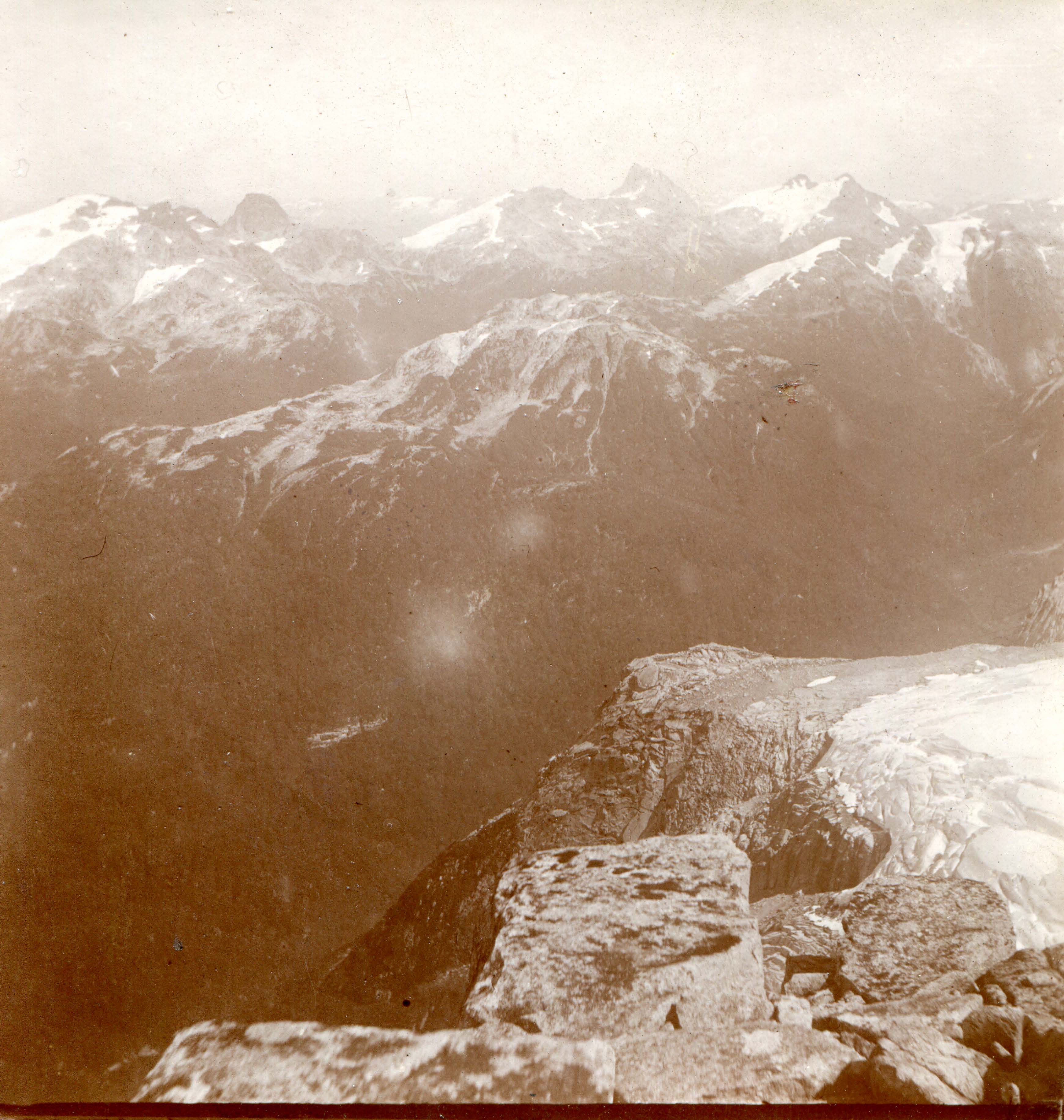 Rocas en primer plano. Cadena montañosa nevada de fondo.