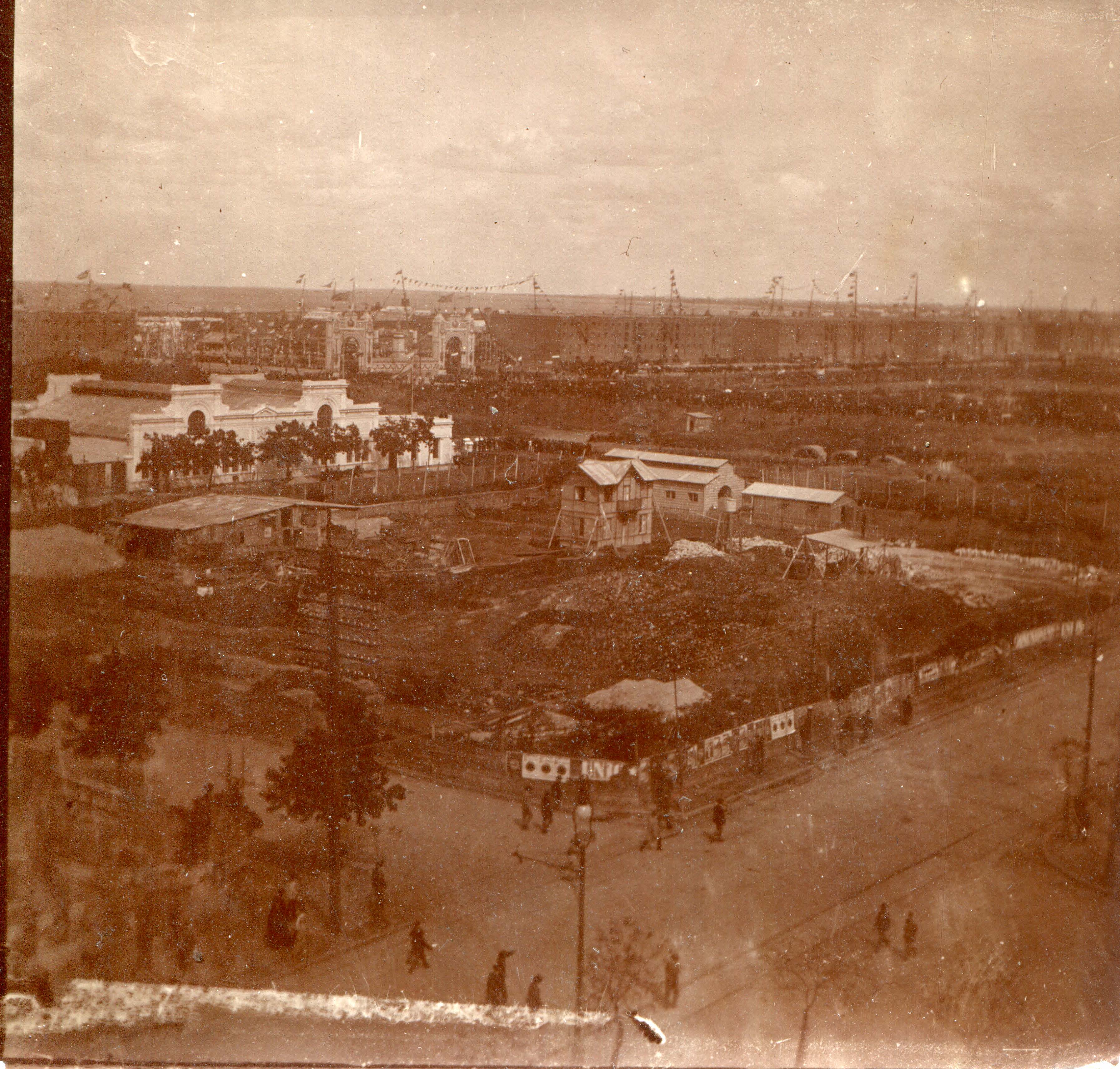 Vista panoramica de una cuidad. Edificio, casas, cableado de electricidad. Personas caminando en calle principal.